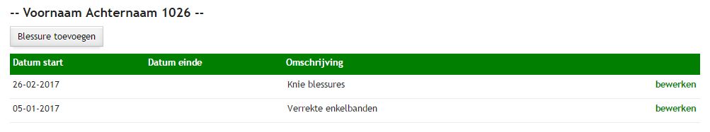 Op deze tab staat een overzicht van de blessures van een speler. Door te klikken op een blessure worden de achterliggende gegevens getoond. Deze kunnen (afhankelijk van de van toepassing zijnde rechten) eventueel worden bewerkt.