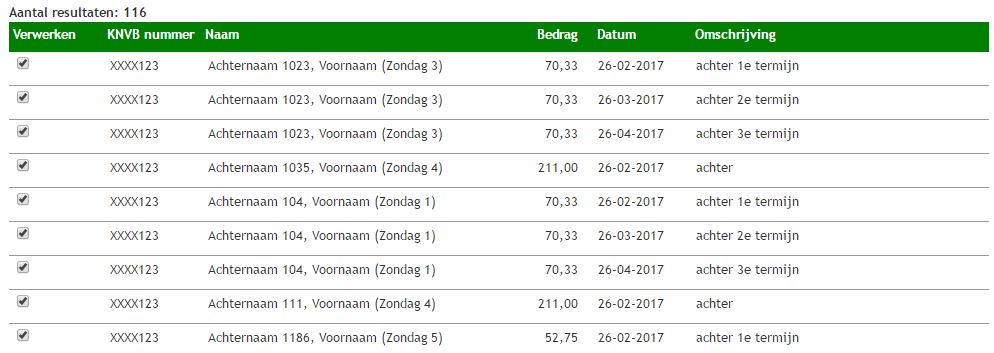 Na het klikken op de knop Toon resultaten worden de leden getoond die vallen onder de gekozen categorie. Leden waarvan al een contributievordering is opgeboekt in het actieve seizoen worden gemarkeerd en niet automatisch geselecteerd om de vorderingen op te boeken. Door te klikken op de knop x vorderingen opboeken worden de vorderingen daadwerkelijk opgeboekt.