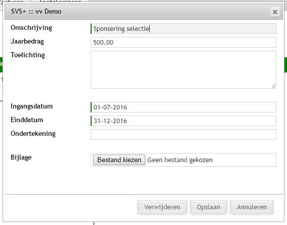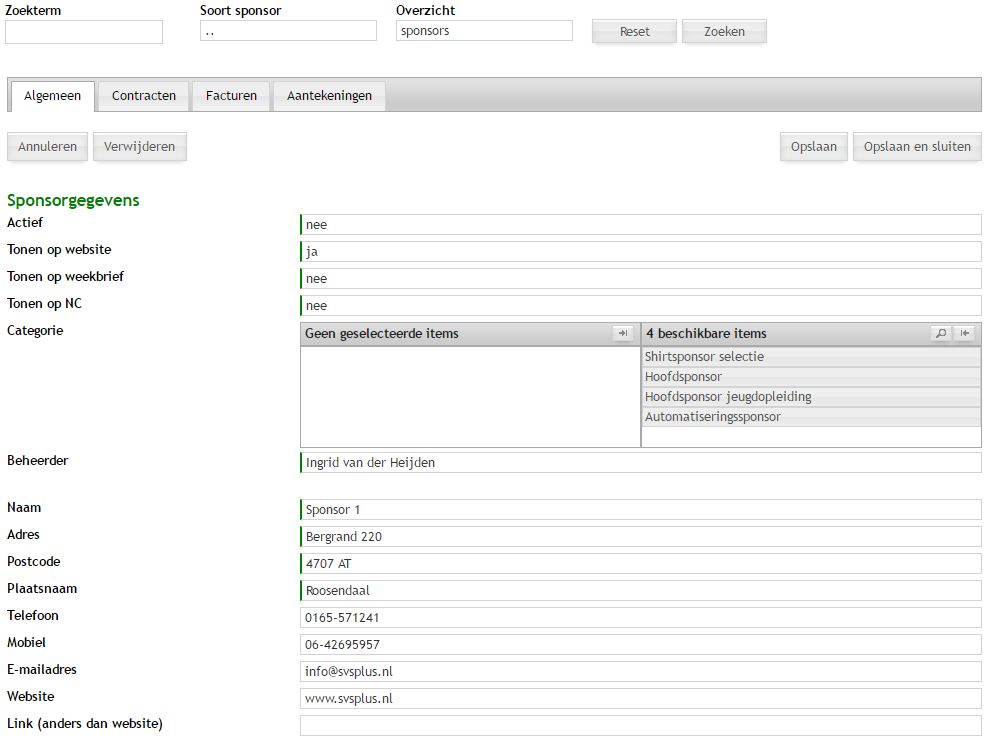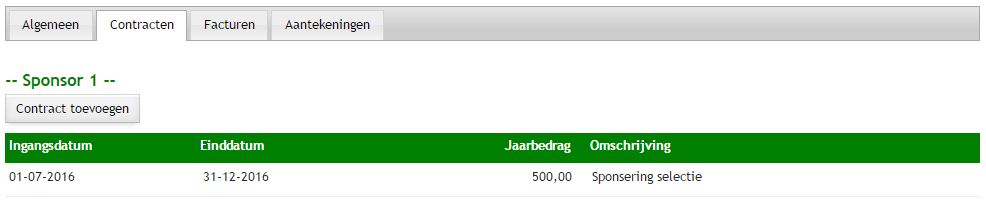 Op de tab Contracten staan de contracten die met een sponsor zijn afgesloten. Per contract worden een aantal gegevens geregistreerd en kan het daadwerkelijke contract (document) worden toegevoegd.