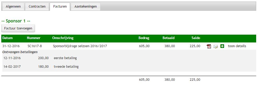 Op de tab Facturen staat een overzicht van de aan een sponsor verstuurde facturen. Een factuur moet altijd worden gekoppeld aan een contract. Per factuur kunnen een aantal gegevens worden geregistreerd en kan een pdf-versie worden gedownload. Door te klikken het pdf-icoontje kan de factuur (pdf-document) worden bekeken. Door te klikken op het e-mail-icoontje kan de factuur per e-mail worden verstuurd. Door te klikken op het +-icoontje kan een betaling worden toegevoegd. Door de te klikken op toon details kunnen de onderliggende details en betalingen van de factuur worden bekeken.