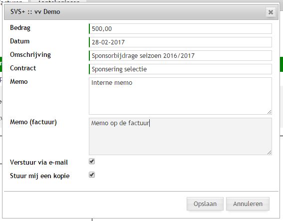 Verstuur via e-mail: als deze optie wordt aangevinkt en er een e-mailadres van de sponsor is geregistreerd, wordt de factuur als pdf-bestand per e-mail verstuurd. De tekst van de e-mail kan worden ingesteld via de configuratiegegevens.