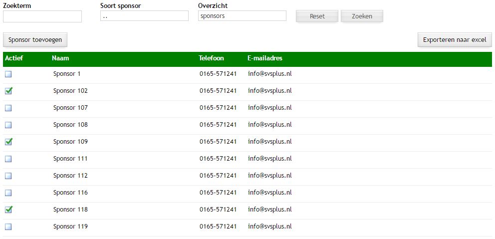Door de klikken op de optie Sponsoring wordt de pagina met de sponsors geopend. Bovenaan de pagina kan worden gezocht naar een specifieke sponsor, soort sponsor of contracten/facturen per seizoen. Door te klikken op de knop Sponsor toevoegen kunt u een sponsor toevoegen. Deze knop ziet u alleen als u sponsors mag bewerken. Meestal heeft u in dat geval de rol sponsorbeheerder.